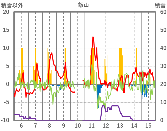 | 日 | 時 | 気温 | 降水 | 風向/風速 | 日照 | 積雪 | 降雪 |