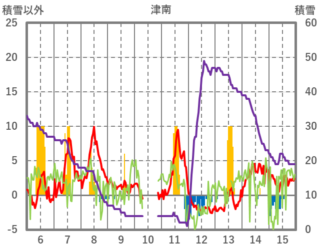 | 日 | 時 | 気温 | 降水 | 風向/風速 | 日照 | 積雪 | 降雪 |