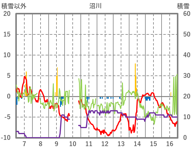 | 日 | 時 | 気温 | 降水 | 風向/風速 | 日照 | 積雪 | 降雪 |