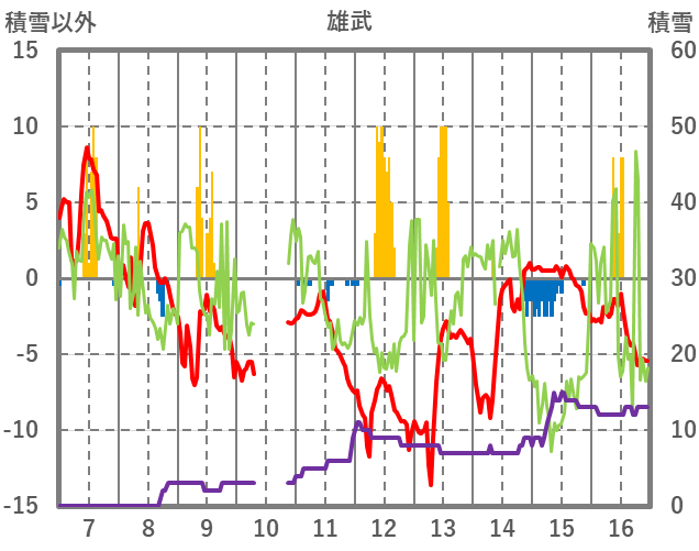 | 日 | 時 | 気温 | 降水 | 風向/風速 | 日照 | 積雪 | 降雪 |
