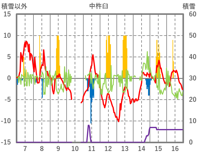 | 日 | 時 | 気温 | 降水 | 風向/風速 | 日照 | 積雪 | 降雪 |