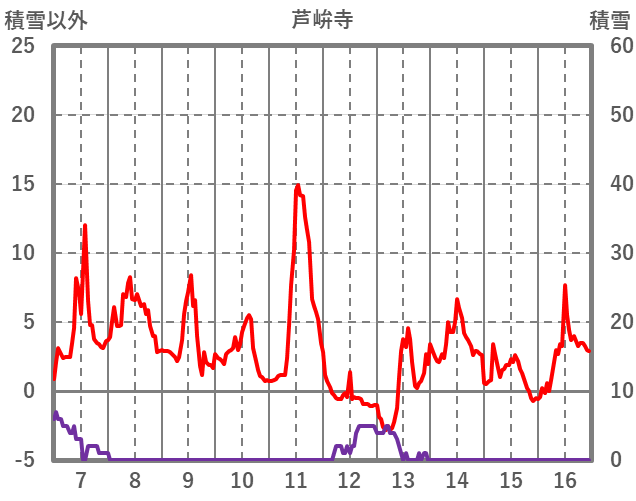 | 日 | 時 | 気温 | 降水 | 風向/風速 | 日照 | 積雪 | 降雪 |