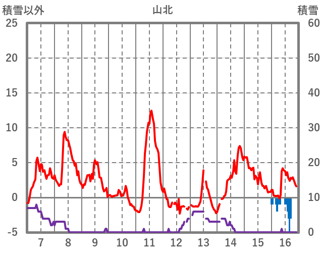 | 日 | 時 | 気温 | 降水 | 風向/風速 | 日照 | 積雪 | 降雪 |