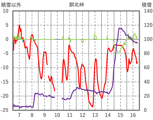 | 日 | 時 | 気温 | 降水 | 風向/風速 | 日照 | 積雪 | 降雪 |