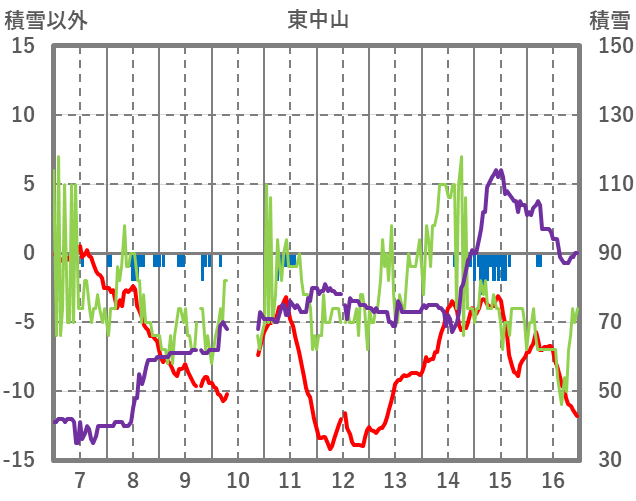 | 日 | 時 | 気温 | 降水 | 風向/風速 | 日照 | 積雪 | 降雪 |