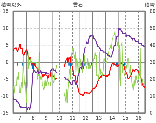 | 日 | 時 | 気温 | 降水 | 風向/風速 | 日照 | 積雪 | 降雪 |