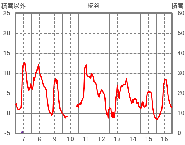 | 日 | 時 | 気温 | 降水 | 風向/風速 | 日照 | 積雪 | 降雪 |