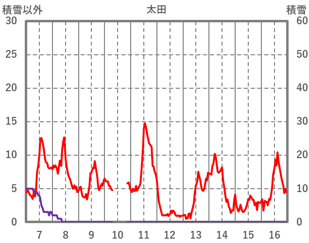 | 日 | 時 | 気温 | 降水 | 風向/風速 | 日照 | 積雪 | 降雪 |