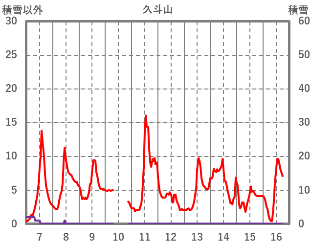 | 日 | 時 | 気温 | 降水 | 風向/風速 | 日照 | 積雪 | 降雪 |