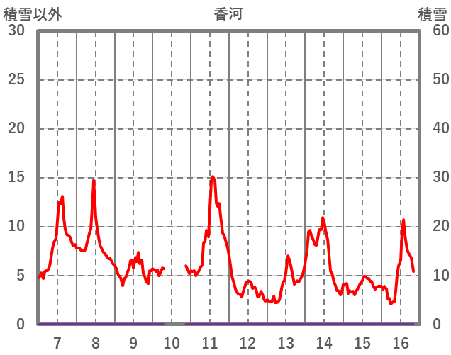 | 日 | 時 | 気温 | 降水 | 風向/風速 | 日照 | 積雪 | 降雪 |