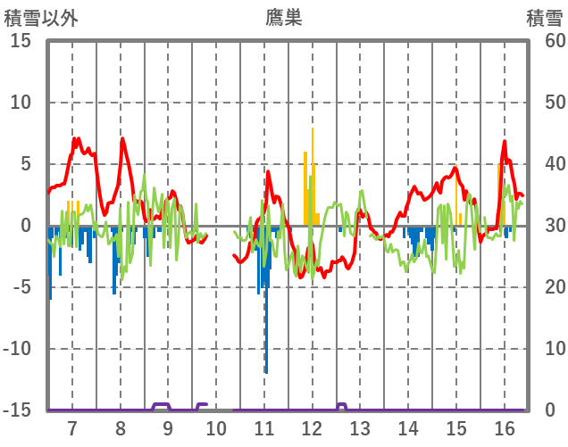 | 日 | 時 | 気温 | 降水 | 風向/風速 | 日照 | 積雪 | 降雪 |