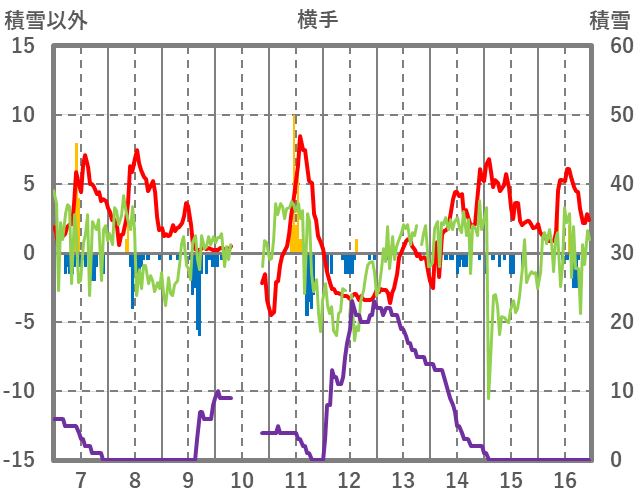 | 日 | 時 | 気温 | 降水 | 風向/風速 | 日照 | 積雪 | 降雪 |
