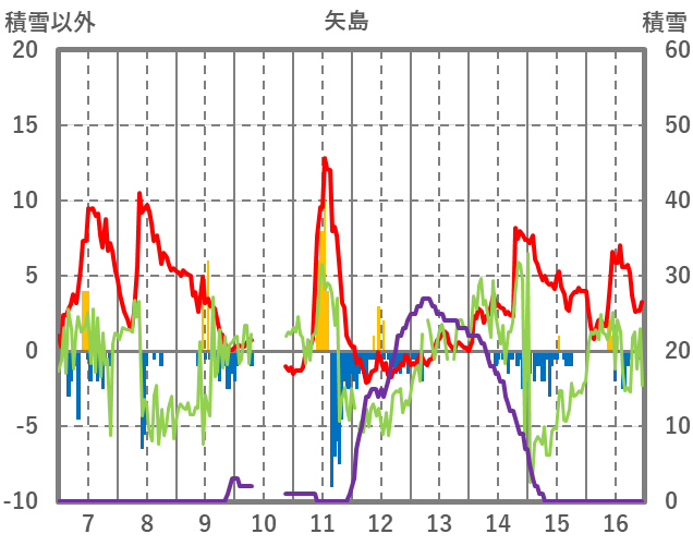 | 日 | 時 | 気温 | 降水 | 風向/風速 | 日照 | 積雪 | 降雪 |
