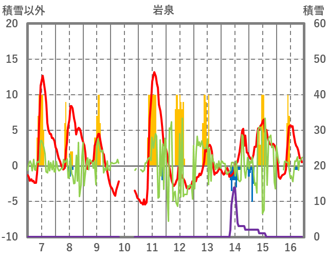| 日 | 時 | 気温 | 降水 | 風向/風速 | 日照 | 積雪 | 降雪 |