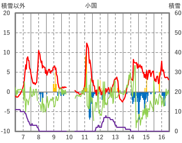| 日 | 時 | 気温 | 降水 | 風向/風速 | 日照 | 積雪 | 降雪 |