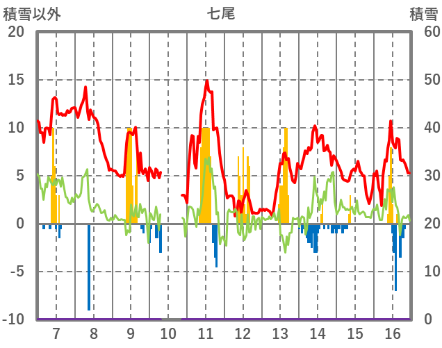 | 日 | 時 | 気温 | 降水 | 風向/風速 | 日照 | 積雪 | 降雪 |
