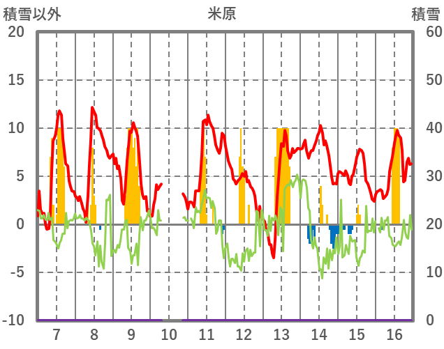 | 日 | 時 | 気温 | 降水 | 風向/風速 | 日照 | 積雪 | 降雪 |