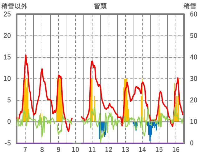 | 日 | 時 | 気温 | 降水 | 風向/風速 | 日照 | 積雪 | 降雪 |