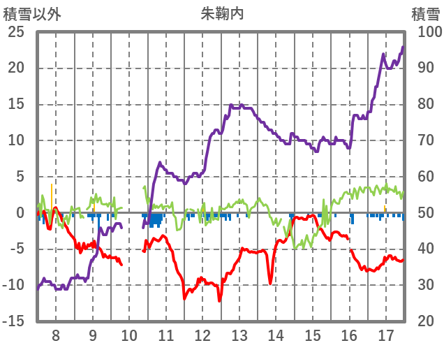 | 日 | 時 | 気温 | 降水 | 風向/風速 | 日照 | 積雪 | 降雪 |