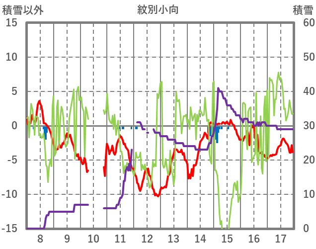 | 日 | 時 | 気温 | 降水 | 風向/風速 | 日照 | 積雪 | 降雪 |