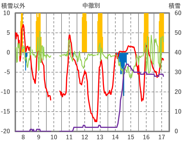 | 日 | 時 | 気温 | 降水 | 風向/風速 | 日照 | 積雪 | 降雪 |