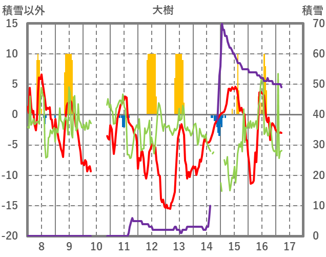 | 日 | 時 | 気温 | 降水 | 風向/風速 | 日照 | 積雪 | 降雪 |