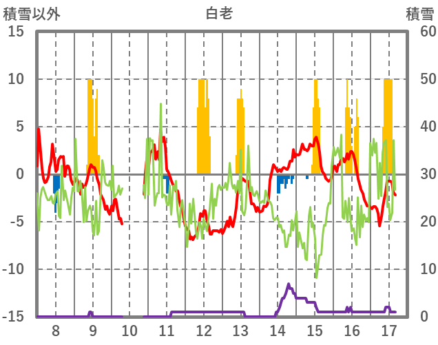 | 日 | 時 | 気温 | 降水 | 風向/風速 | 日照 | 積雪 | 降雪 |