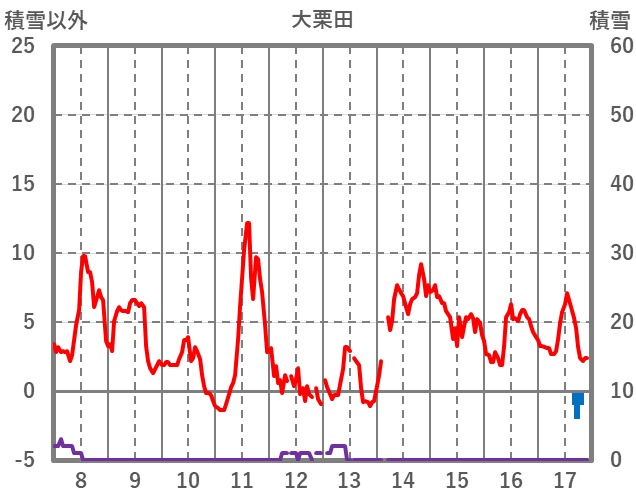 | 日 | 時 | 気温 | 降水 | 風向/風速 | 日照 | 積雪 | 降雪 |