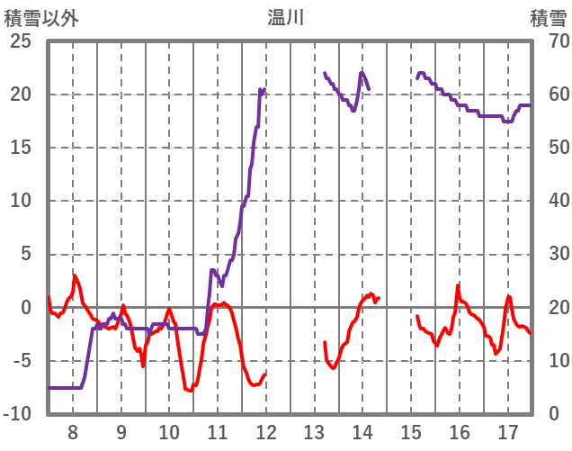 | 日 | 時 | 気温 | 降水 | 風向/風速 | 日照 | 積雪 | 降雪 |