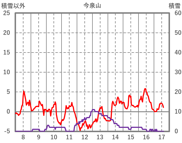 | 日 | 時 | 気温 | 降水 | 風向/風速 | 日照 | 積雪 | 降雪 |