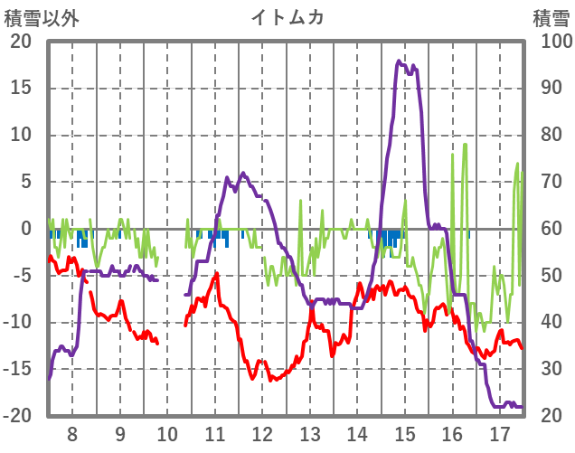 | 日 | 時 | 気温 | 降水 | 風向/風速 | 日照 | 積雪 | 降雪 |
