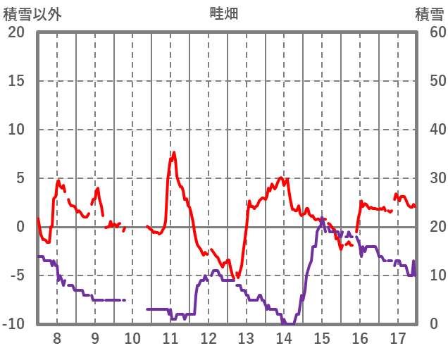 | 日 | 時 | 気温 | 降水 | 風向/風速 | 日照 | 積雪 | 降雪 |