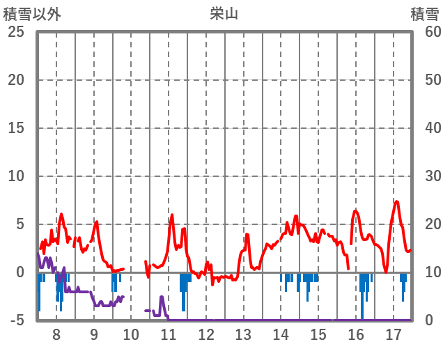 | 日 | 時 | 気温 | 降水 | 風向/風速 | 日照 | 積雪 | 降雪 |