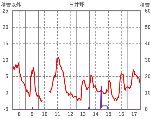 | 日 | 時 | 気温 | 降水 | 風向/風速 | 日照 | 積雪 | 降雪 |