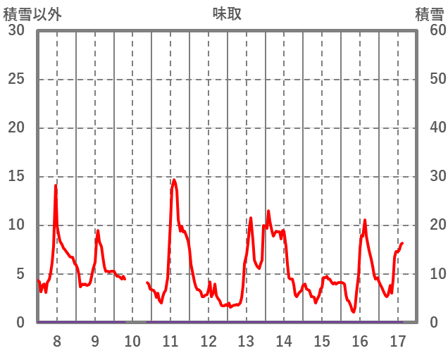 | 日 | 時 | 気温 | 降水 | 風向/風速 | 日照 | 積雪 | 降雪 |