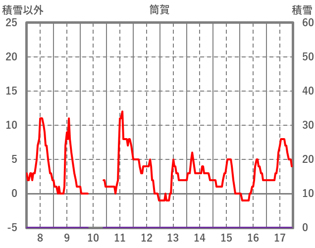 | 日 | 時 | 気温 | 降水 | 風向/風速 | 日照 | 積雪 | 降雪 |