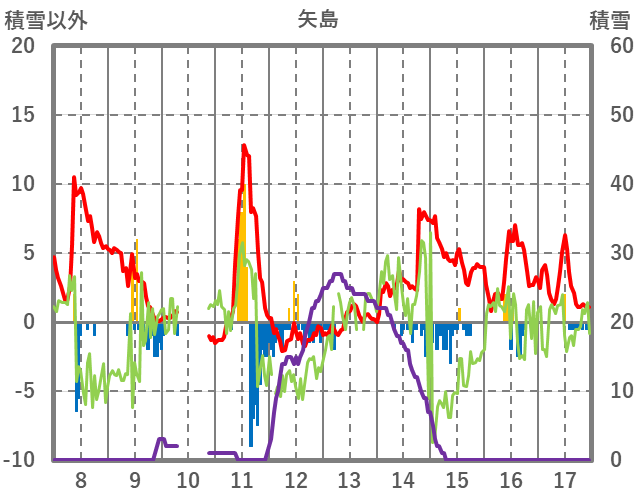| 日 | 時 | 気温 | 降水 | 風向/風速 | 日照 | 積雪 | 降雪 |