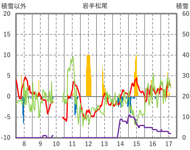 | 日 | 時 | 気温 | 降水 | 風向/風速 | 日照 | 積雪 | 降雪 |