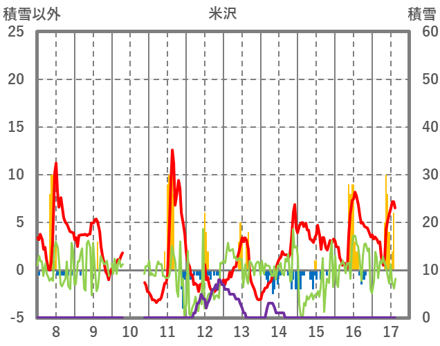 | 日 | 時 | 気温 | 降水 | 風向/風速 | 日照 | 積雪 | 降雪 |