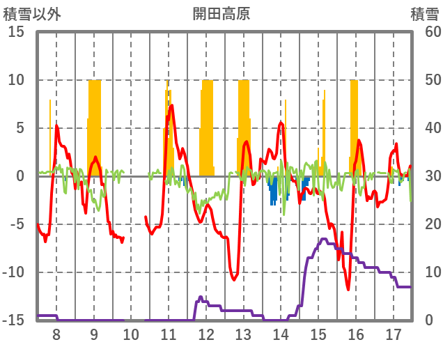 | 日 | 時 | 気温 | 降水 | 風向/風速 | 日照 | 積雪 | 降雪 |