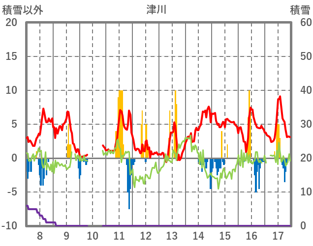| 日 | 時 | 気温 | 降水 | 風向/風速 | 日照 | 積雪 | 降雪 |