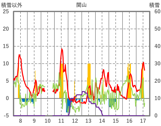 | 日 | 時 | 気温 | 降水 | 風向/風速 | 日照 | 積雪 | 降雪 |