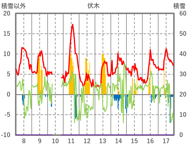 | 日 | 時 | 気温 | 降水 | 風向/風速 | 日照 | 積雪 | 降雪 |