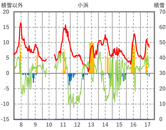 | 日 | 時 | 気温 | 降水 | 風向/風速 | 日照 | 積雪 | 降雪 |