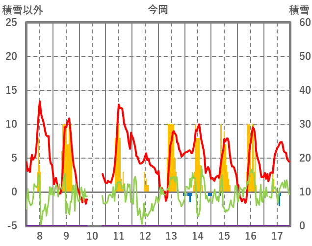 | 日 | 時 | 気温 | 降水 | 風向/風速 | 日照 | 積雪 | 降雪 |