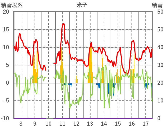 | 日 | 時 | 気温 | 降水 | 風向/風速 | 日照 | 積雪 | 降雪 |