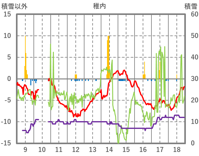 | 日 | 時 | 気温 | 降水 | 風向/風速 | 日照 | 積雪 | 降雪 |