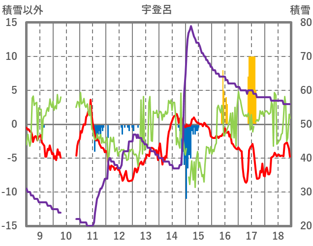 | 日 | 時 | 気温 | 降水 | 風向/風速 | 日照 | 積雪 | 降雪 |