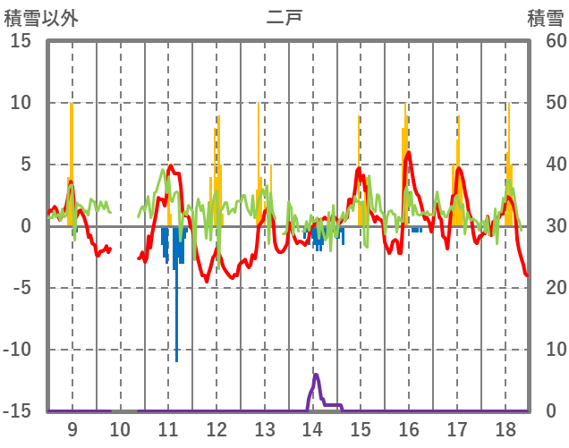 | 日 | 時 | 気温 | 降水 | 風向/風速 | 日照 | 積雪 | 降雪 |