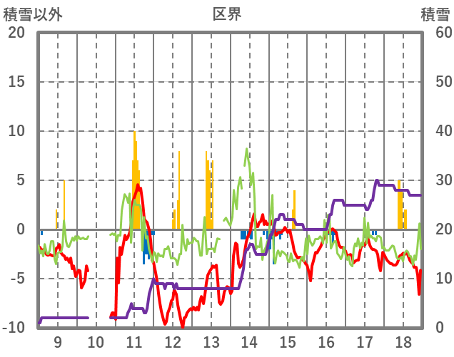 | 日 | 時 | 気温 | 降水 | 風向/風速 | 日照 | 積雪 | 降雪 |